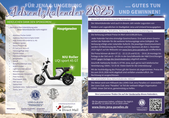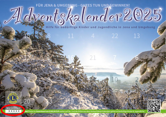 Unser Adventskalender wird auch in diesem Jahr zugunsten von Kindern und Jugendlichen in Stadtgebiet Jena und Umland herausgegeben. Wir danken allen Unterstützern und wünschen den Kalenderbesitzern schon jetzt viel Glück bei der Verlosung.